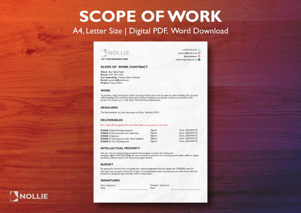 This Scope of Work Contract template is an effective tool for ensuring clear communication and understanding between a designer and client for an upcoming project.